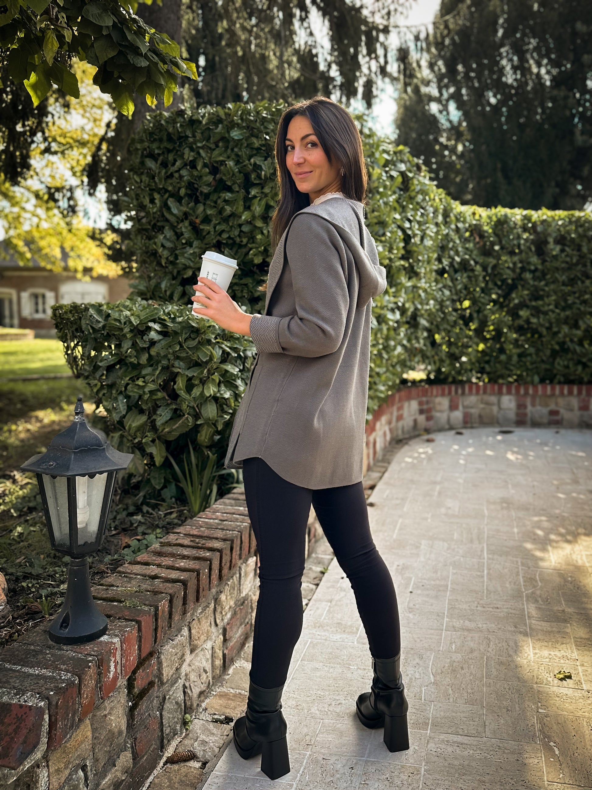 Ce gilet long droit à capuche en maille épaisse est magnifique. Son effet blazer apporte une touche structurée, tandis que la doublure à motif délicat révèle un détail raffiné. Deux grandes poches complètent ce modèle à l’élégance naturelle.