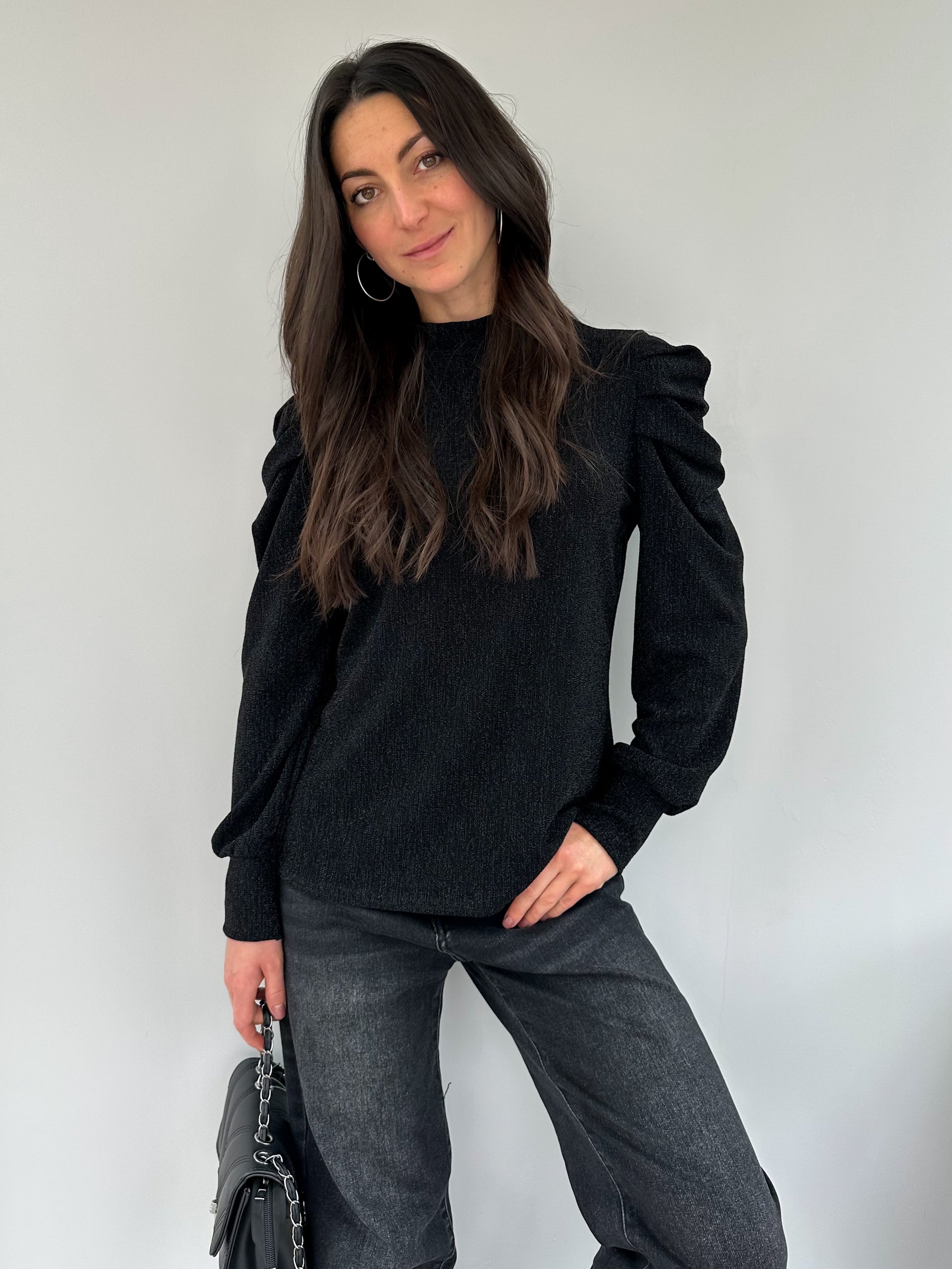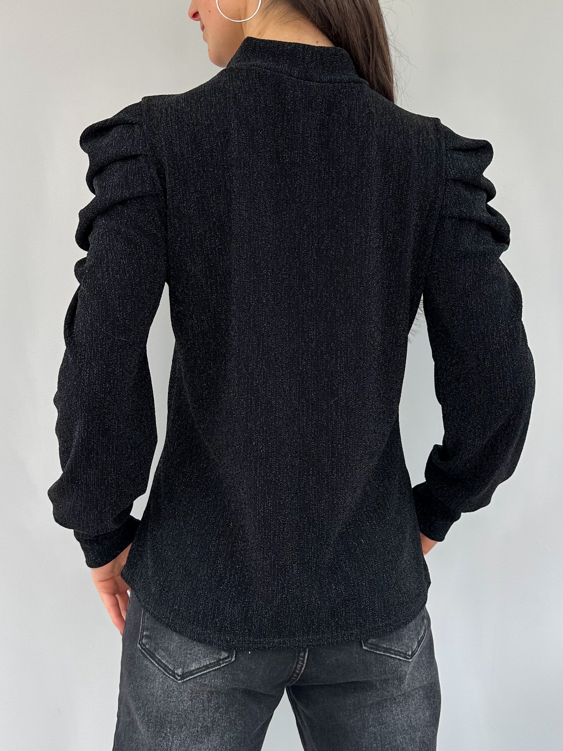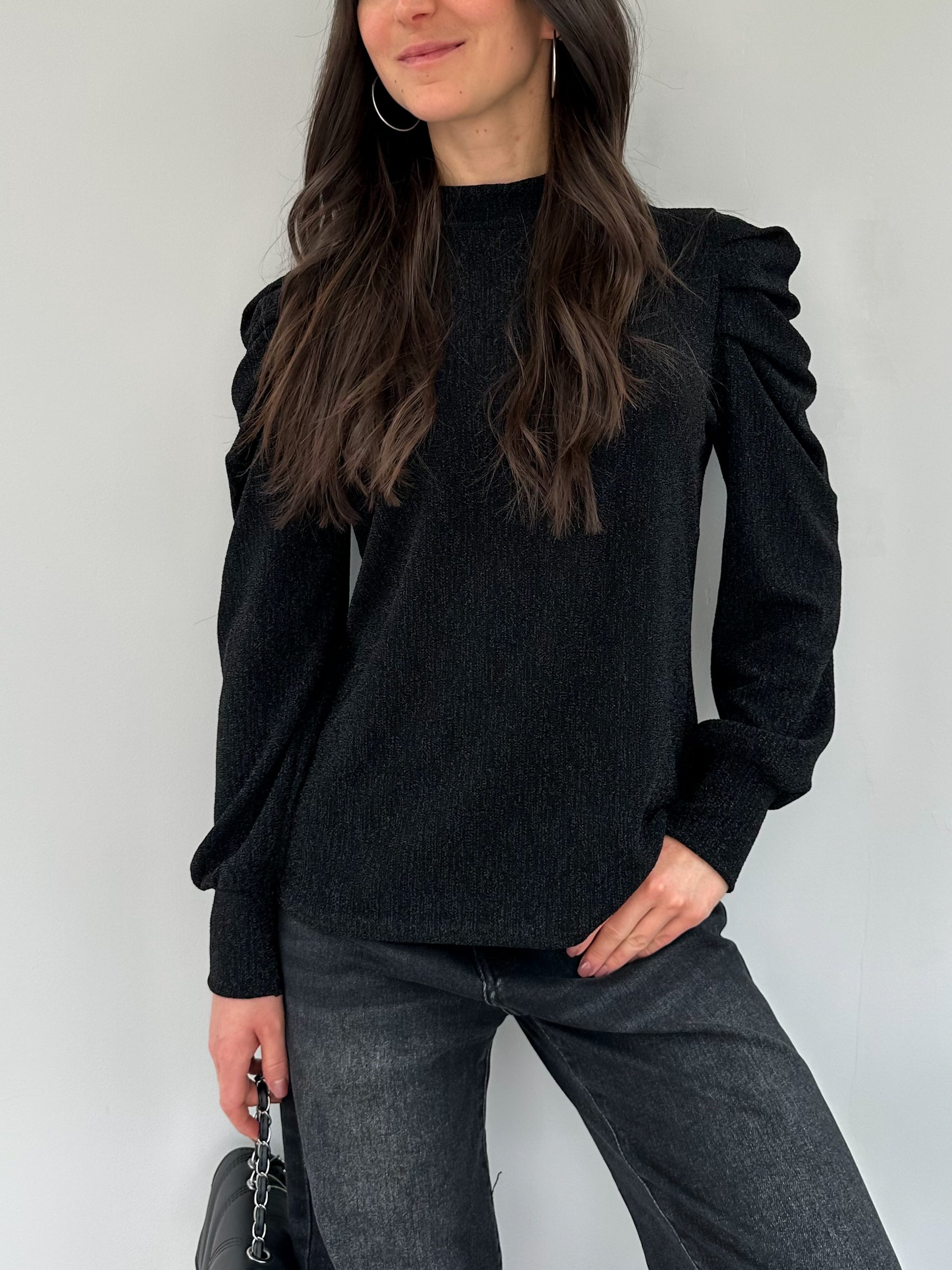 Haut uni noir délicatement pailleté, doté d’épaulettes bouffantes qui structurent la silhouette. Une pièce au caractère affirmé, parfaite pour apporter une touche glamour et tendance à vos tenues.