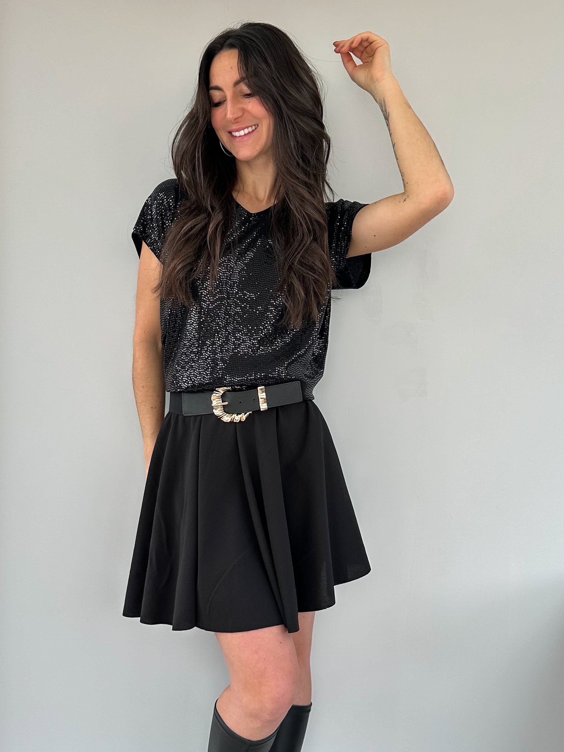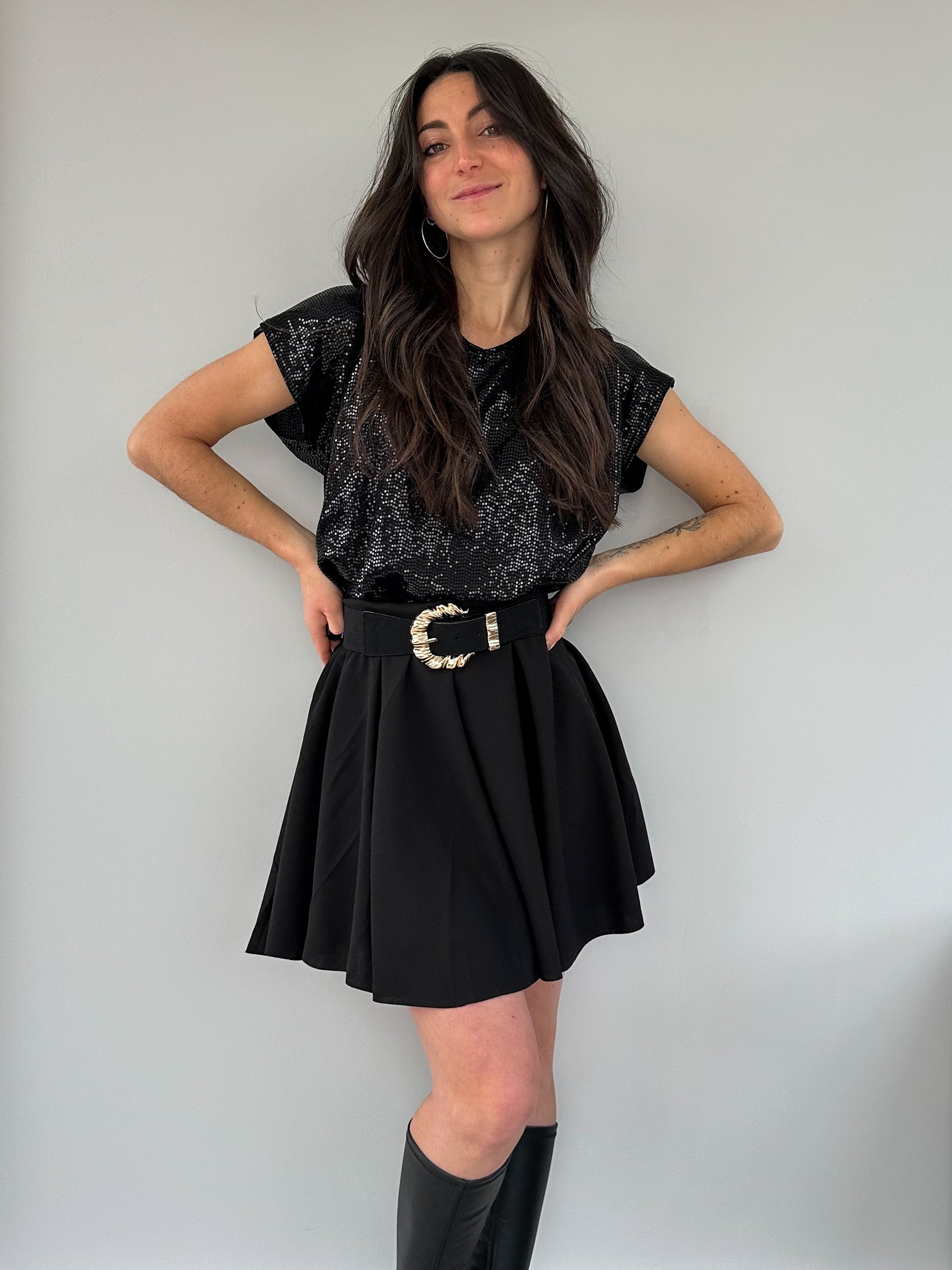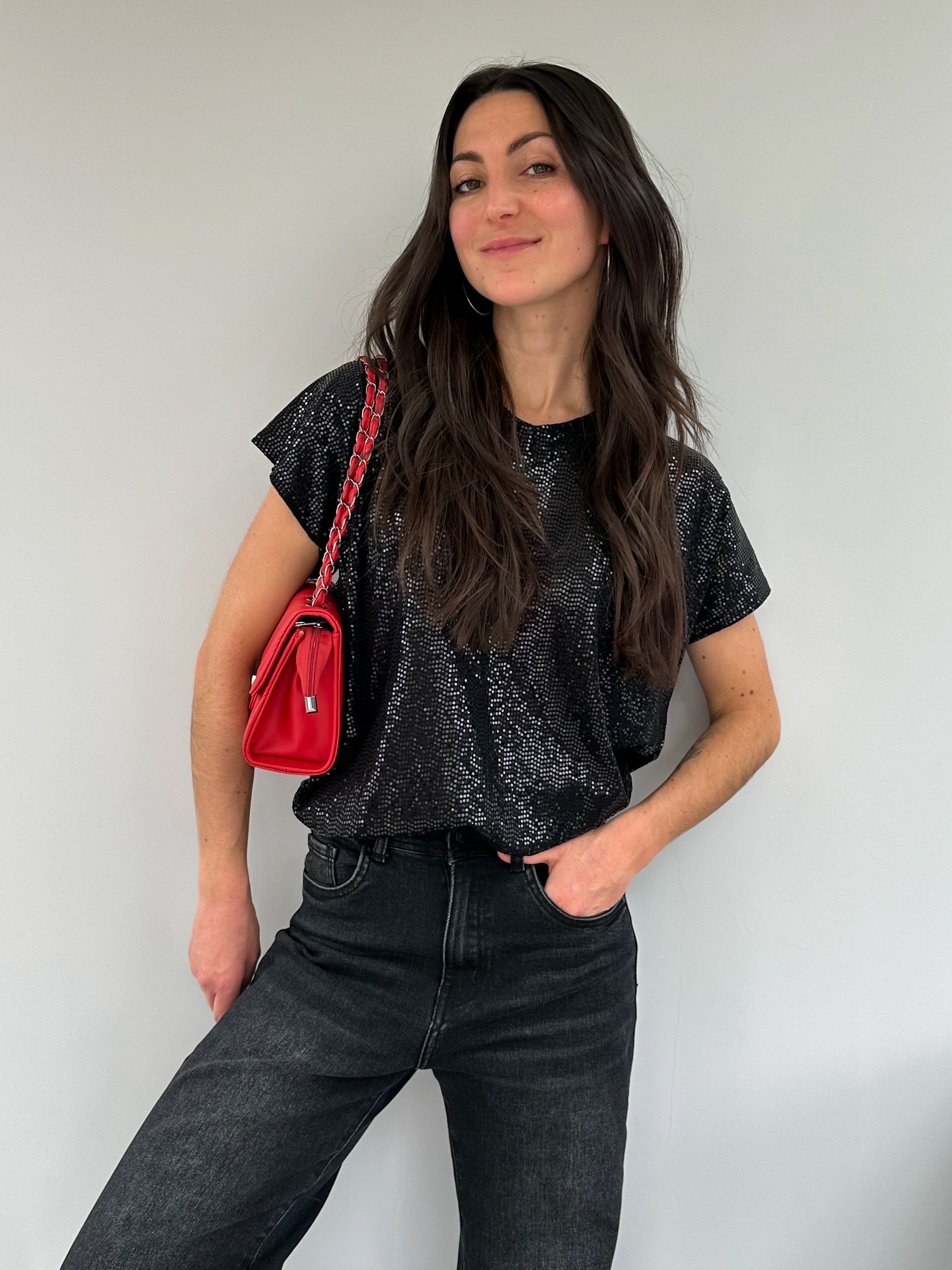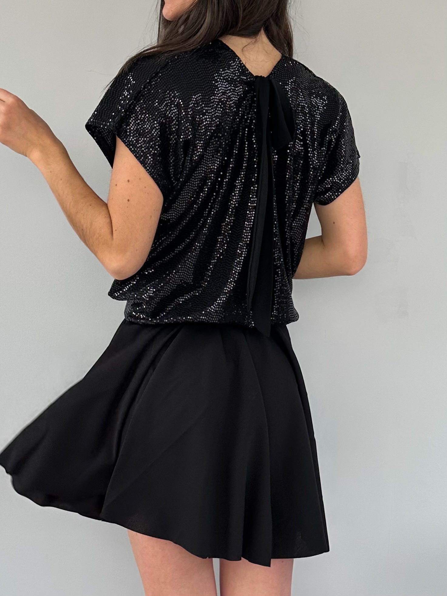Haut uni noir sublimé par de délicats sequins ton sur ton, pour une brillance élégante et maîtrisée. Son ruban noir à nouer dans le dos apporte une touche féminine et raffinée, révélant subtilement le dos.