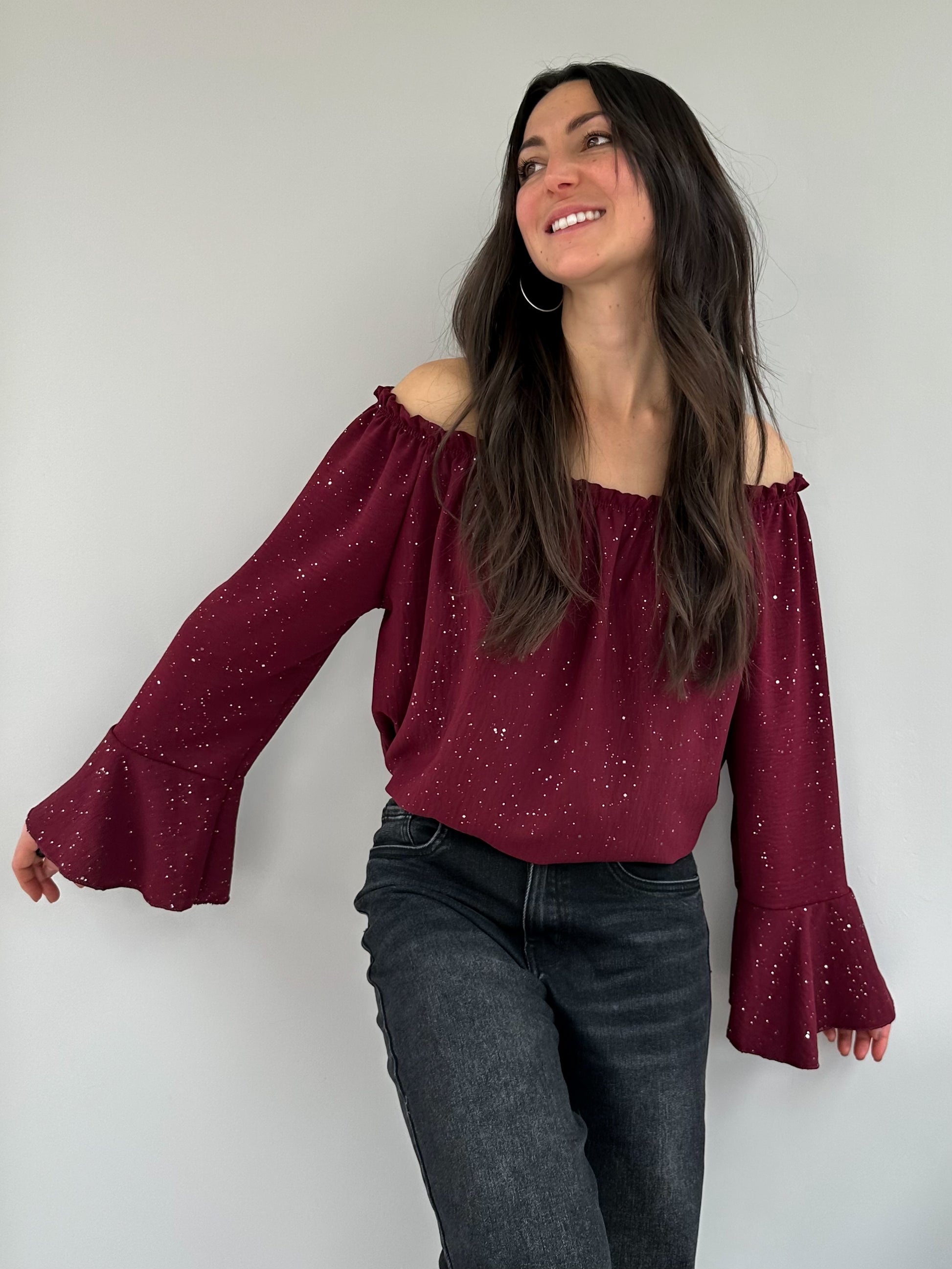 Haut uni délicatement orné de paillettes, doté de manches au bas évasé pour une allure fluide et féminine. Son col élastiqué permet de le porter sur les épaules, dévoilant subtilement le décolleté pour un style à la fois sexy et bohème.