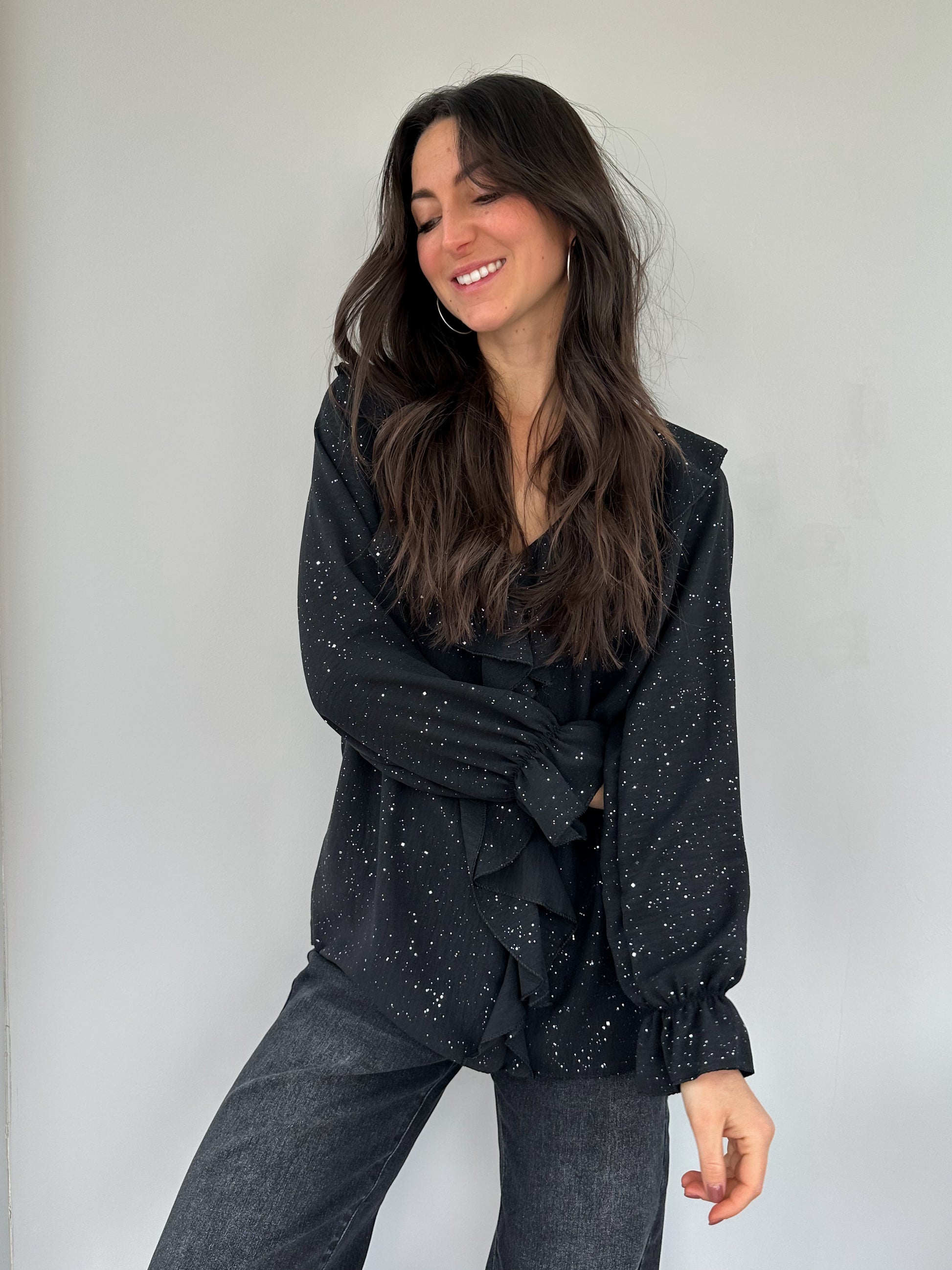 Haut uni délicatement orné de paillettes, sublimé par un volant continu du col jusqu’au bas du top. Les manches à bas élastiqué apportent une touche de structure pour un rendu élégant et raffiné.