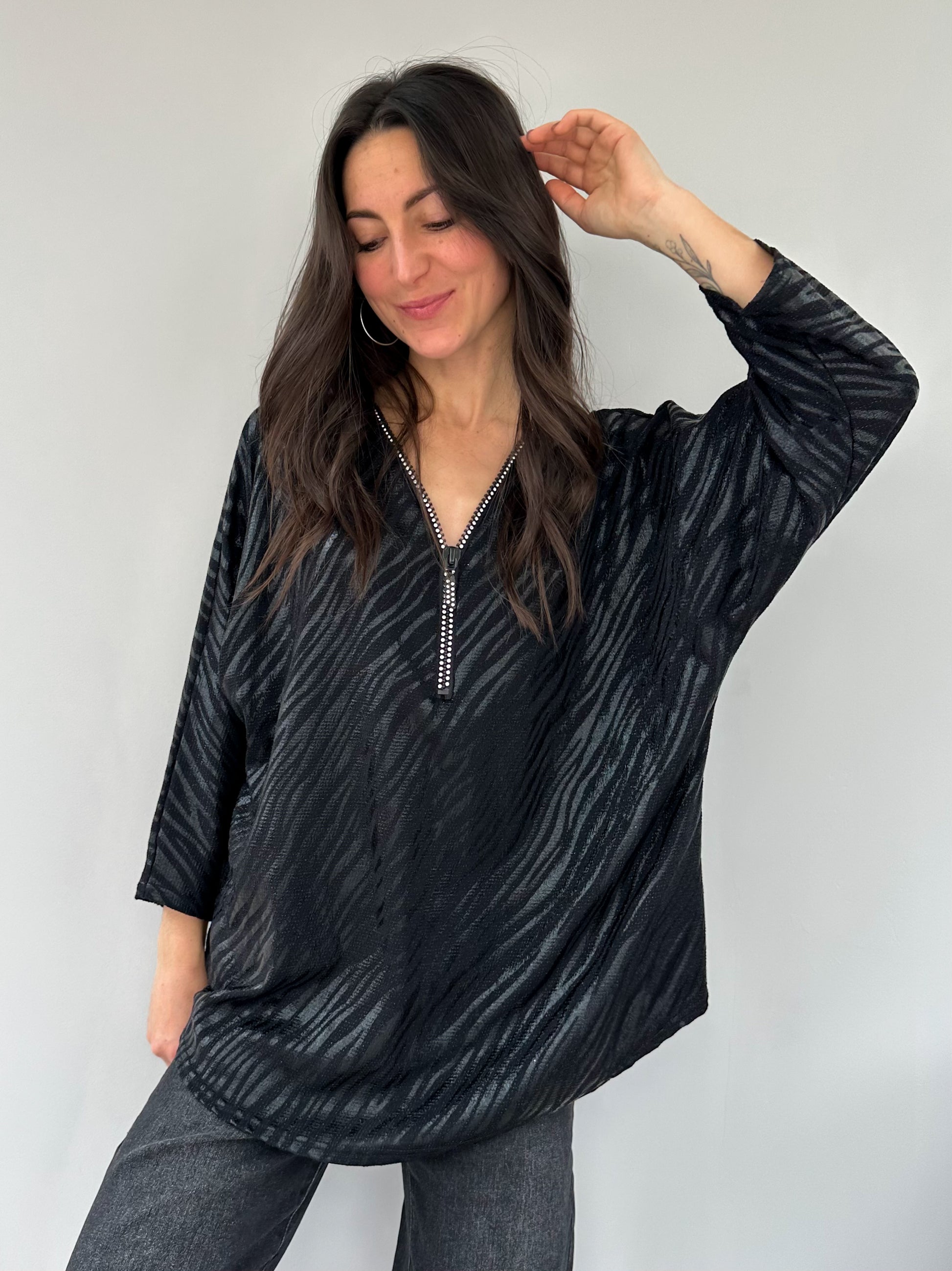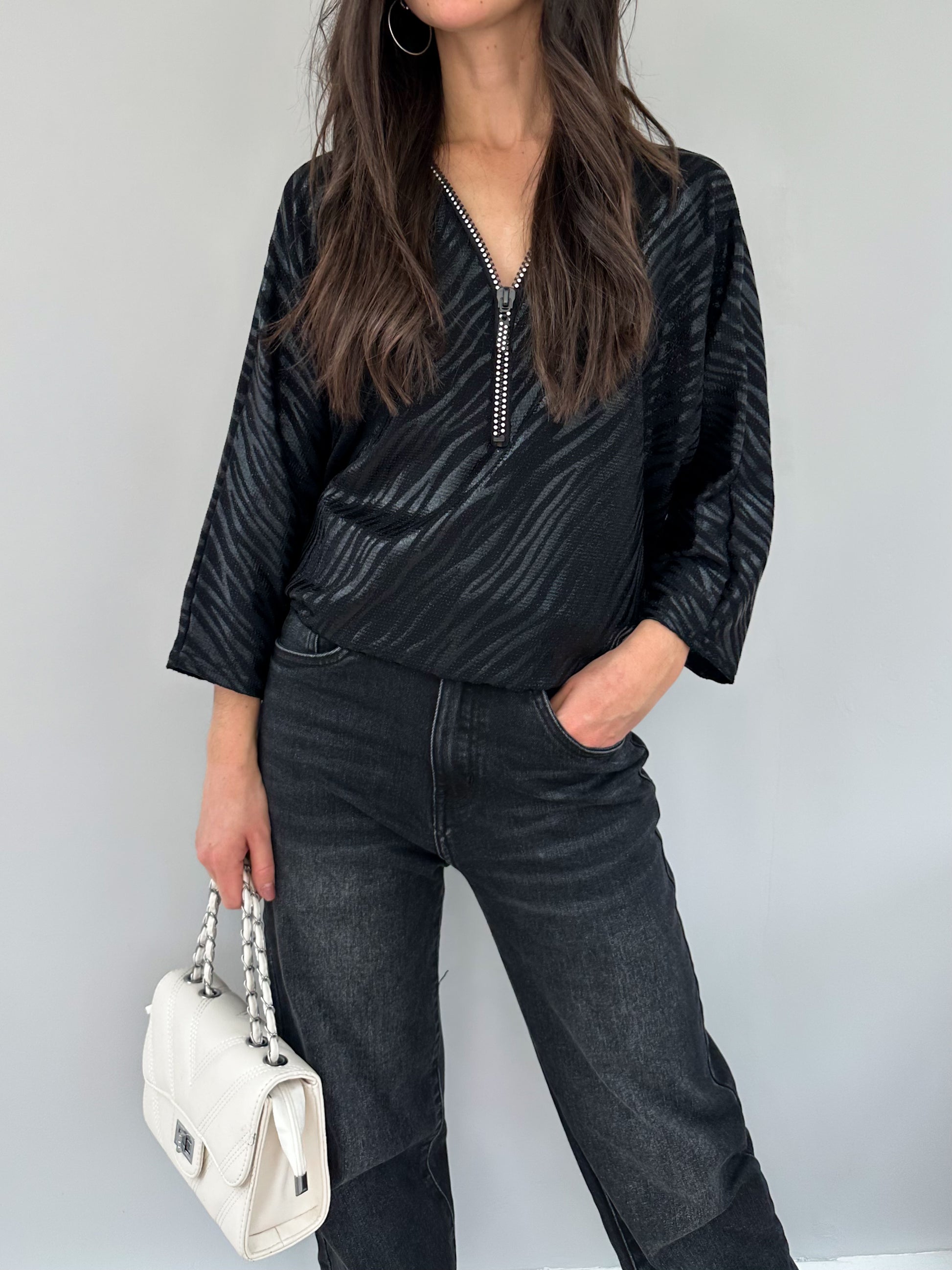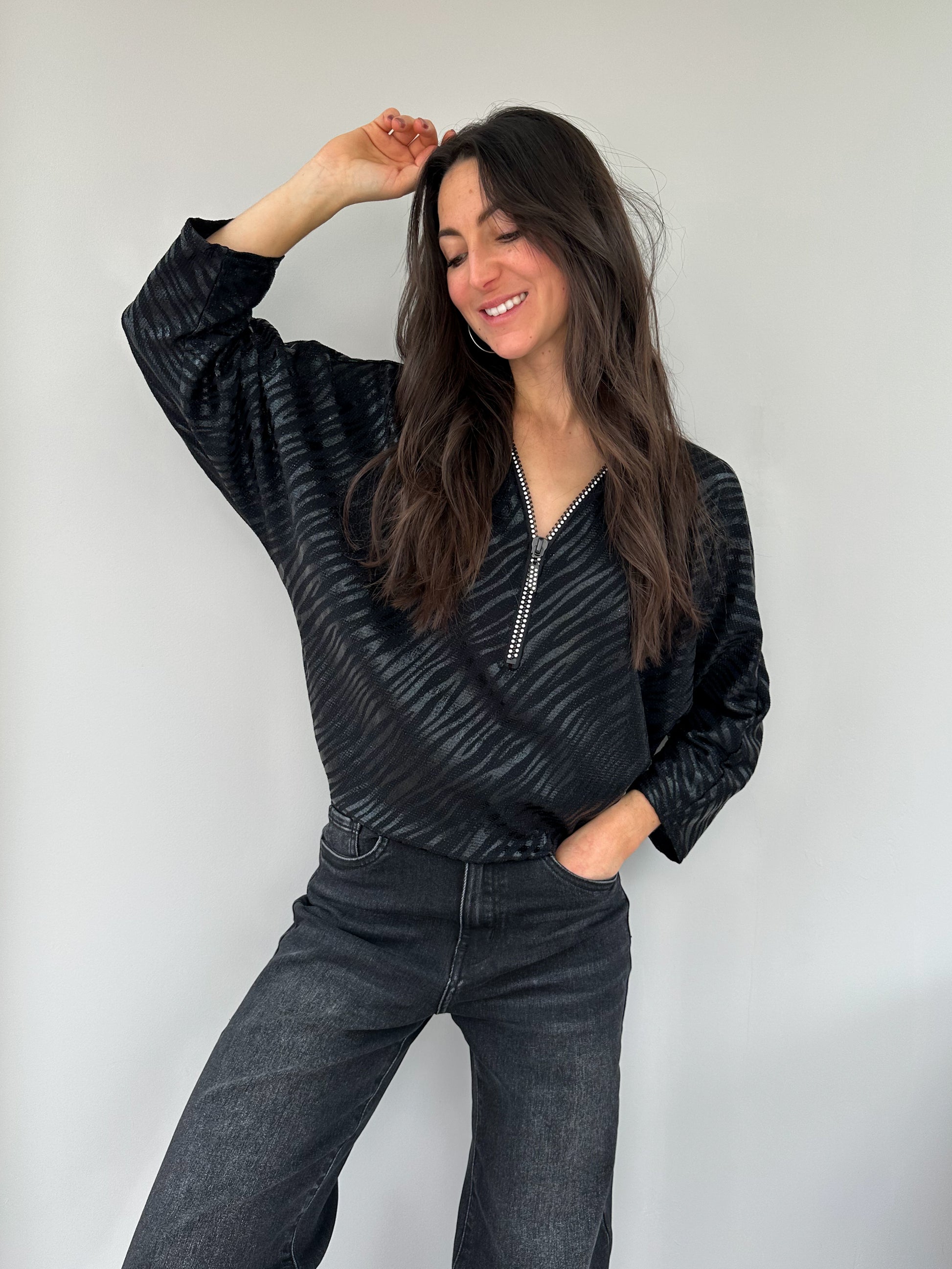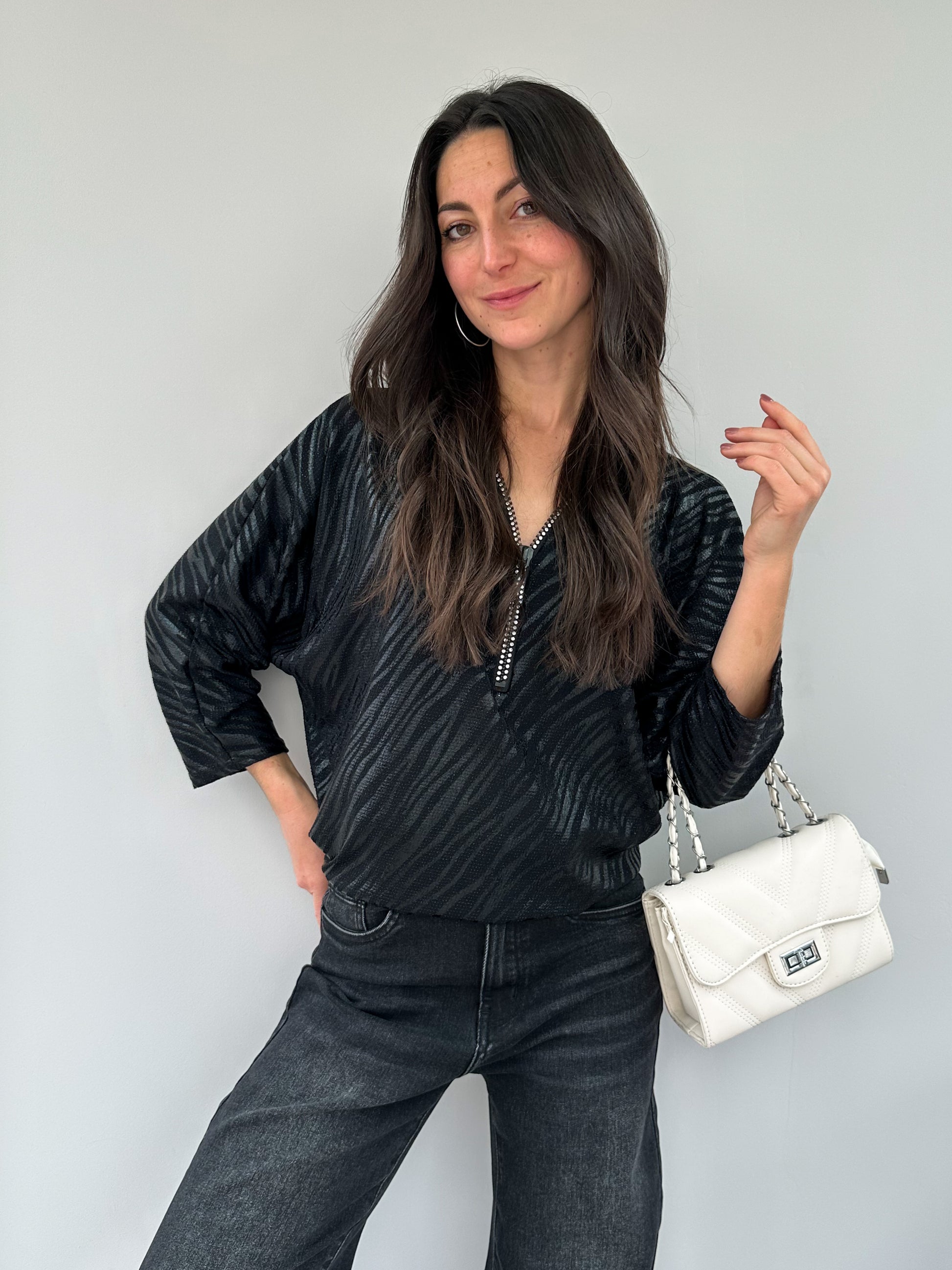 Haut uni noir sublimé par des motifs zébrés brillants ton sur ton. Son col en V est rehaussé d’une fermeture éclair ornée de strass argentés, apportant une touche glamour et audacieuse à la silhouette.