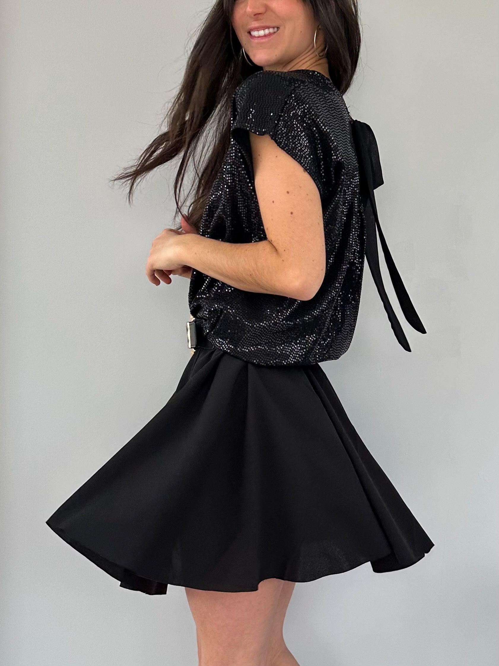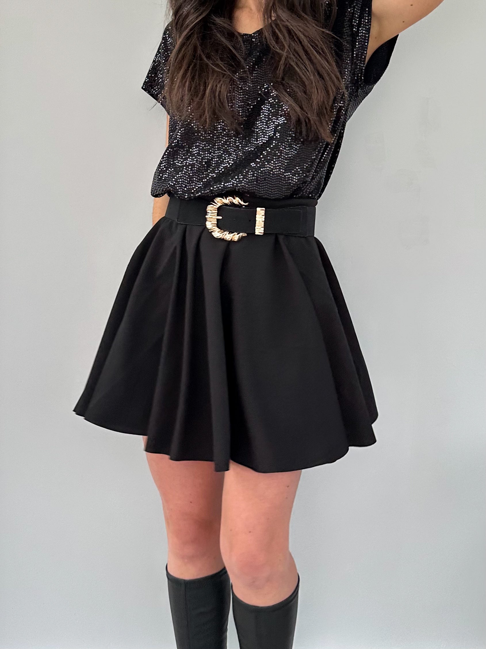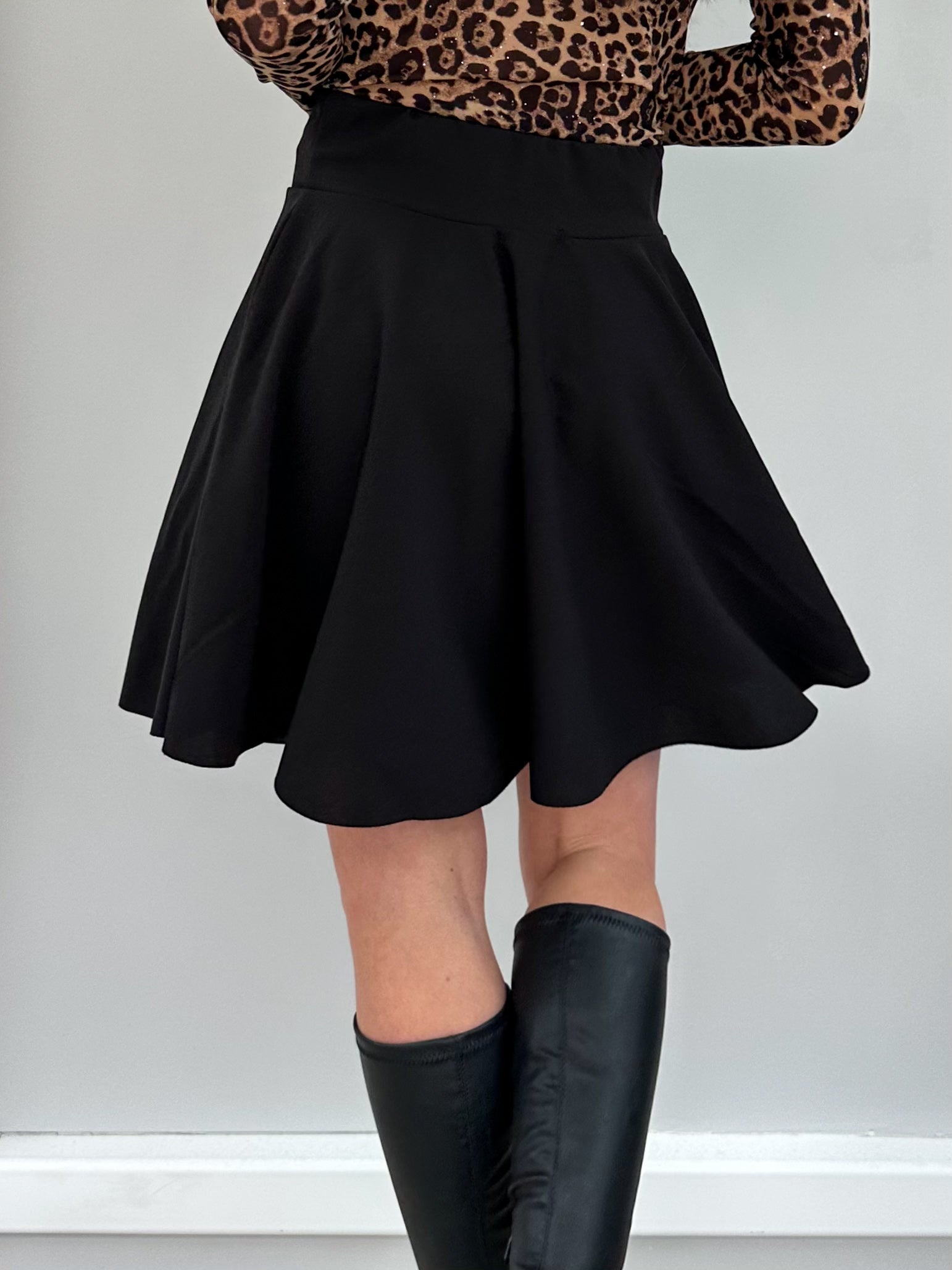 Jupe patineuse noire au tombé fluide, dotée d’une taille élastiquée pour un confort optimal. Une pièce essentielle qui allie élégance et simplicité, facile à porter au quotidien.