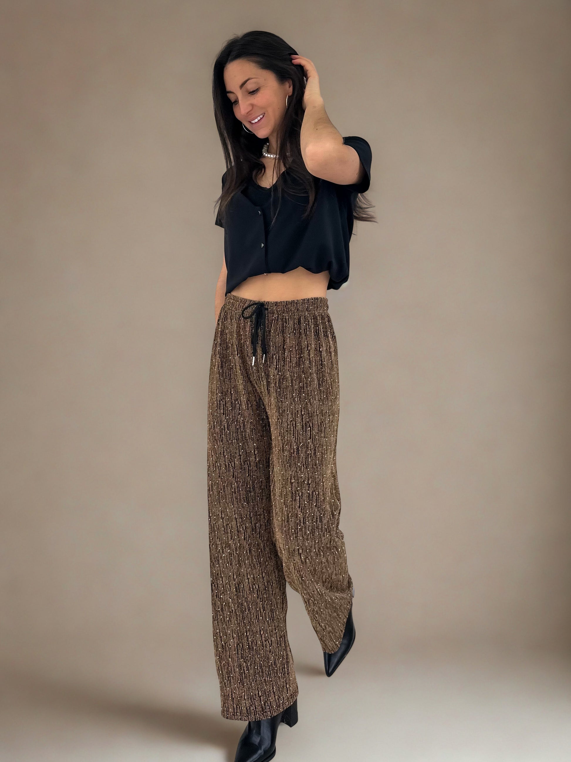 Pantalon fluide à strass et fils brillants, légèrement évasé pour une silhouette élégante. Sa taille élastiquée avec cordon assure un confort absolu. Un modèle qui apporte juste ce qu’il faut d’éclat, parfait autant pour le quotidien que pour les fêtes.