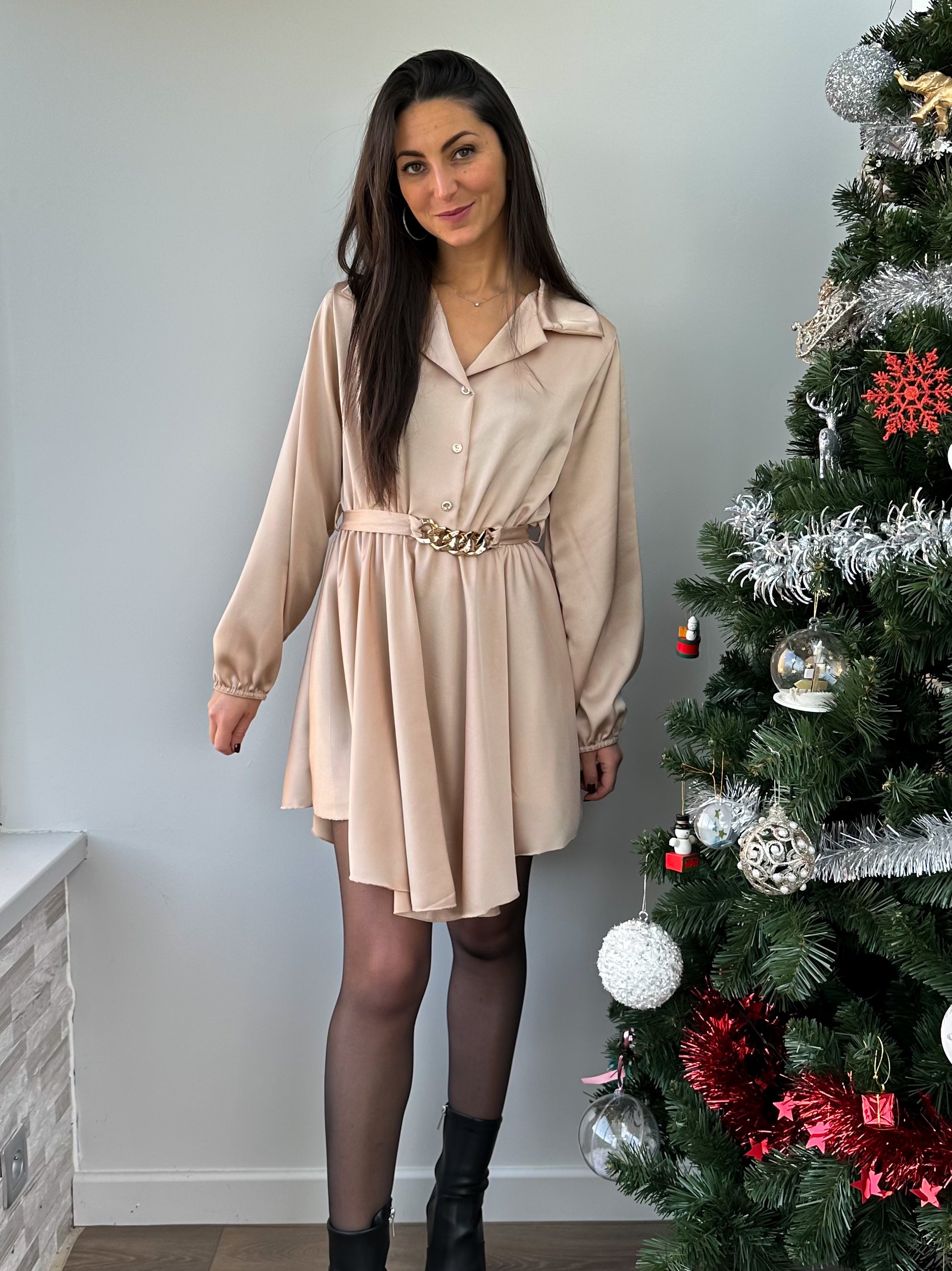 Cette robe courte combine un haut effet chemisier chic avec une jupe patineuse fluide pour une silhouette féminine et harmonieuse. Conçue dans un tissu effet satin, elle offre un tombé lumineux et raffiné. Sa taille est délicatement cintrée par une ceinture dorée qui apporte une touche glamour et moderne.